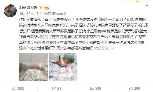 然而在去年10月時,洛麗塔為了想讓臉看起來更小,便前往醫美整形進行削骨的手術,但是在手術時醫生不小心失手割到動脈,當下立刻將她送到醫院,更因此住進了加護病房中,由於當時的洛麗塔處於昏迷中,沒辦法第一時間跟粉絲說明,一時間網友猜測紛紛她出了車禍,一時之間造謠無數。然而洛麗塔清醒後,也發了微博解釋一切:「我是去整容了,削骨結果醫生一刀割到了動脈,送來醫院的時候整個人已經休克,搶救過來了」,非常驚悚。