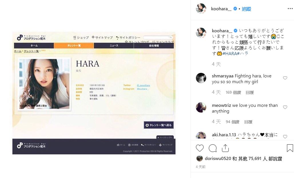 韓國女星具荷拉上月在自家輕生被送醫救回後,已經秘密前往日本休養1個月,再度現身的具荷拉,也宣布和日本「尾木製作」簽訂專屬合約並將在當地復出,當時具荷拉也透過SNS向外界透露近況,並以日文表示「一直都非常感謝大家關照,我會更加努力的」。