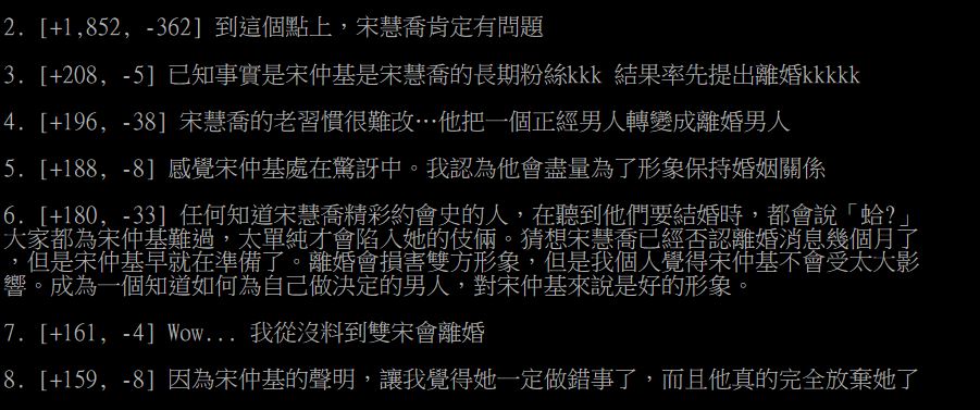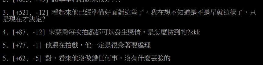 反觀台灣網友則指出宋仲基的聲明稿不僅搶快又強調「傷痛」,加上韓國性別歧視,根本是刻意扭曲宋慧喬,並紛紛平反到「講的好像宋仲基沒交過女友一樣」、「男方聲明很帶風向 ...」、「那個聲明很可怕完全不演了」網友認為兩人應該一起發聲明,否則會像現況對宋慧喬傷害很大。