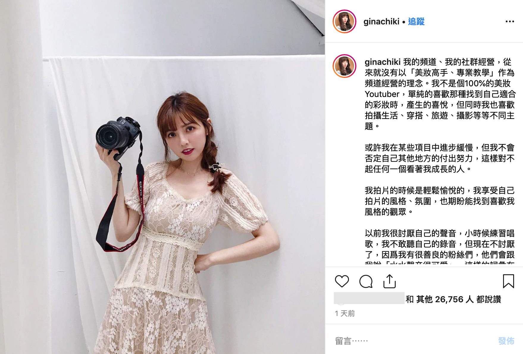 Gina近日透過IG發文,開頭就強調「我的頻道、我的社群經營,從來就沒有以『美妝高手、專業教學』作為頻道經營的理念。」表示自己雖然很喜歡研究彩妝,不過「同時我也喜歡拍攝生活、穿搭、旅遊、攝影等等不同主題。」並沒有要將自己定位成為專職的美妝Youtuber。