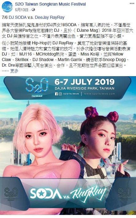 7月6至7日,泰國S2O潑水音樂節(S2O Songkran Music Festival)即將在台北的大佳河濱公園舉辦,當天邀請14位國際DJ共襄盛舉,就連DJ Soda也將來到台灣,讓台灣粉絲也能一睹「亞洲最性感女DJ」的風采。