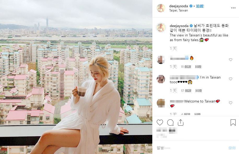 而不少粉絲看到DJ Soda都激動表示「好漂亮」、「脫下你的浴袍吧」、「美景搭配美人」,也有台灣網友認出照片中的台北地標101而興奮說到「歡迎來到台灣」、「好像就在我隔壁房」、「天啊已經在台灣了」。