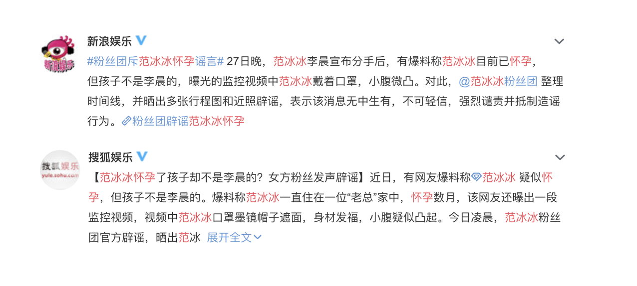 對此傳聞,范冰冰的官方粉絲團也出面闢謠,並公布多張照片澄清說道:「回看上半年時間線,2019年4月時,她去藏區做公益,輸液、吸氧不斷,2019年5月時,她出席活動,腳踩高跟,衣著蕾絲透明內搭,2019年6月時,她外出身著束腰衣,不久前拍攝雜誌,完成妝發吃工作餐,依舊不忘減肥事業,吃著減肥餐,拍攝路透身著緊身包裙和細尖高跟鞋。」,指出范冰冰並沒有懷孕,且將會對不當的言論採取法律手段,嚴厲的駁斥了此傳言。