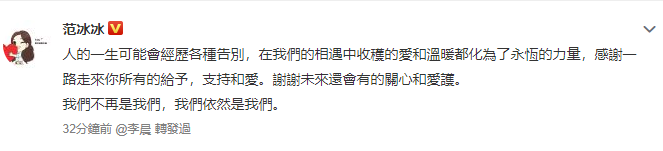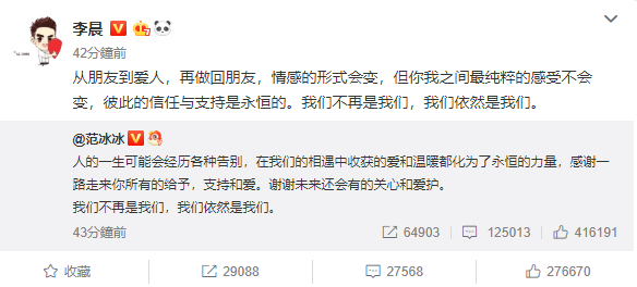 大陸女星「范冰冰」在昨日(27號)晚間於微博發文宣布分手李晨,在文中寫道:「感謝一路走來你所有的給予,支持和愛。謝謝未來還會有的關心和愛護。我們不再是我們,我們依然是我們。 」,隨後李晨也轉發了這條微博,稱二人從朋友到愛人再做回朋友。消息一出震驚全網,也瞬間登上微博熱搜榜上,然而事發後許多網友也開始紛紛猜測兩人分手的原因,在微博上更瘋傳范冰冰其實已經懷孕,但孩子的生父並非李晨,並曬出多張對話截圖,震驚全網。