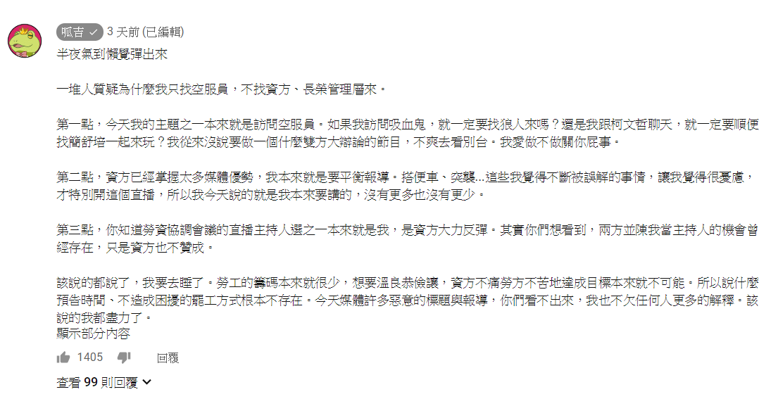 本月24日,「呱吉」於自己的頻道上直播,並邀請了長榮航空的空服員與工會成員來到直播現場,談論關於此次長榮罷工的緣由和狀況,而空服員也在直播中講述了一些關於空服員在工作職場上遭遇到的待遇和困境,直播當日也有許多網友在線上留言,引發正反兩方激烈的在線上討論,當時對於這場直播,「呱吉」則直言「資方已經掌握太多媒體優勢,我本來就是要平衡報導。」「勞工的籌碼本來就很少,想要溫良恭儉讓,資方不痛勞方不苦地達成目標本來就不可能。」等話語,來闡述自己的立場和看法。
