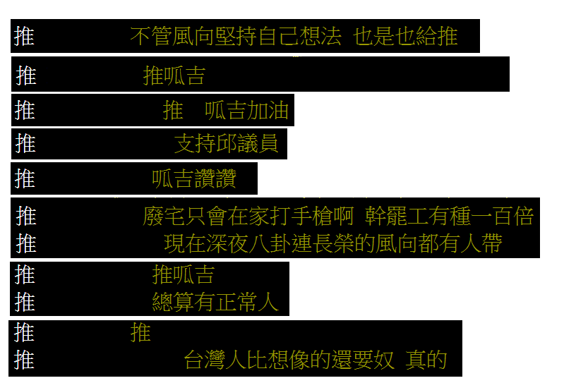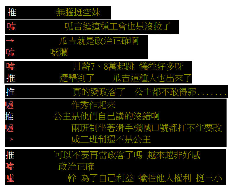 而「呱吉」的聲援和支持,也讓PTT版上掀開了正反的論戰,一方的網友譴責「呱吉」的看法和言論,紛紛留言批判「無腦挺空妹」「呱吉挺這種工會也是沒救了」「月薪7、8萬起跳 犧牲好多呀」「真的變政客了 公主都不敢得罪.......」,然而也有人大力讚賞「呱吉」「不管風向堅持自己想法 也是也給推」「推 呱吉加油」「支持邱議員」「台灣人比想像的還要奴 真的」。