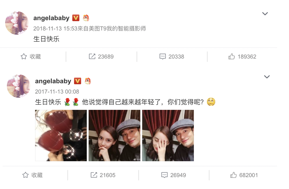 在兩人剛結婚的1、2年內時常會在微博上曬出甜蜜的合照,又或是每當生日時兩人總是會在微博上曬出慶生的合照以及打出一長串文字,但是在今年2月28日Angelababy生日時,黃曉明僅發出他和小海綿的照片,並寫下:「生快美媽」,然而Angelababy在2018黃曉明生日時,也僅發文字「生日快樂」,在2017年Angelababy更曬出兩人的合照,還調皮的寫道:「他說覺得自己越來越年輕,你們覺得呢?」,兩年的祝福相差許多。