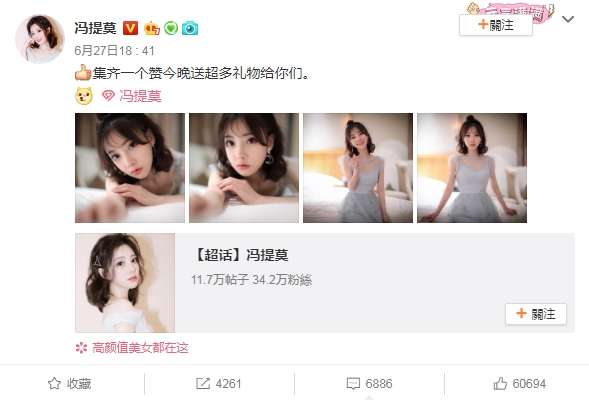 「鬥魚一姐」馮提莫近日在微博上曬出一組自己的美照,並搭配文字:「集齊一個讚今晚送超多禮物給你們。」,美麗的照片和可愛的言論一出,直接讓粉絲們全都融化,直言:「妳要多少讚都給妳!」,另外,照片中的她趴在床上自拍的角度也十分引人遐想,也是一大亮點。