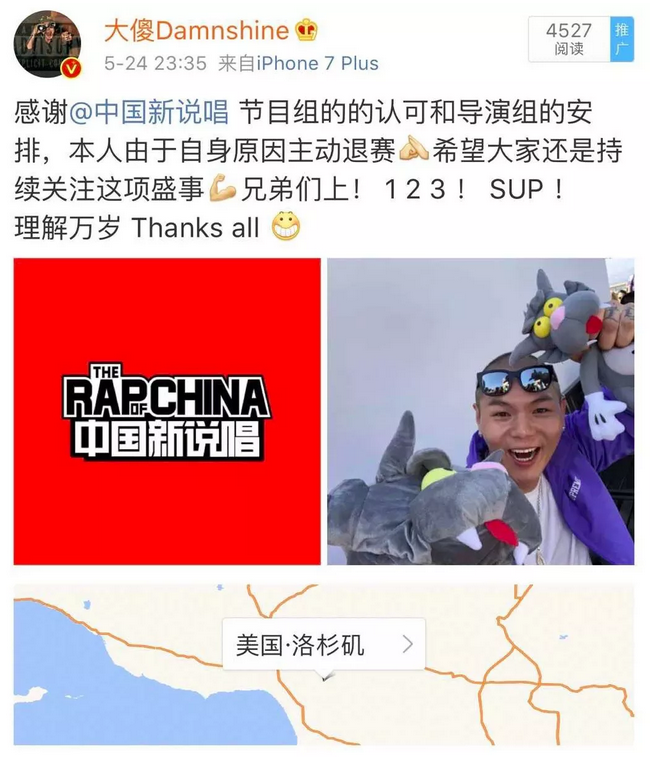 大傻在2018年時曾參加《中國新說唱》,因為超堅強的實力甚至被網友看好是奪冠的熱門候選人,但他卻在海選沒多久後突然在微博上發文寫下:「本人由於自身原因主動退賽,希望大家還是持續關注這項盛事」,在當時網友更列出五大原因分析大傻退賽的原因,包含:知道冠軍是內定的、身上太多紋身被勸退、過去被爆太多黑料、和節目組沒有談妥以及去美國看球賽的總決賽,但針對網友這5大質疑,大傻始終沒有給出明確的答案。