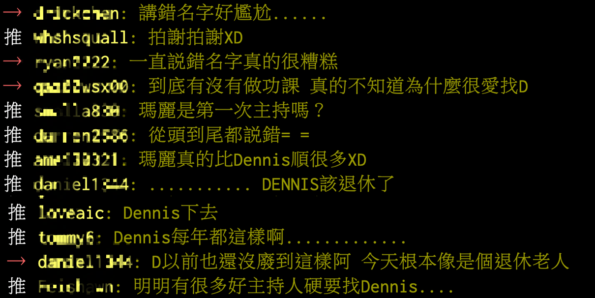 然而PTT網友們也不斷在留言區寫下:「從頭到尾都說錯= =」、「一直說錯名字真的很糟糕」、「到底有沒有做功課 真的不知道為什麼很愛找D」、「DENNIS該退休了」、「Dennis母湯」、「有夠失禮」、「Dennis每年都這樣啊」,網友更一面倒認為另外一位主持人瑪麗的功力大勝Dennis,引起網友熱烈討論。
