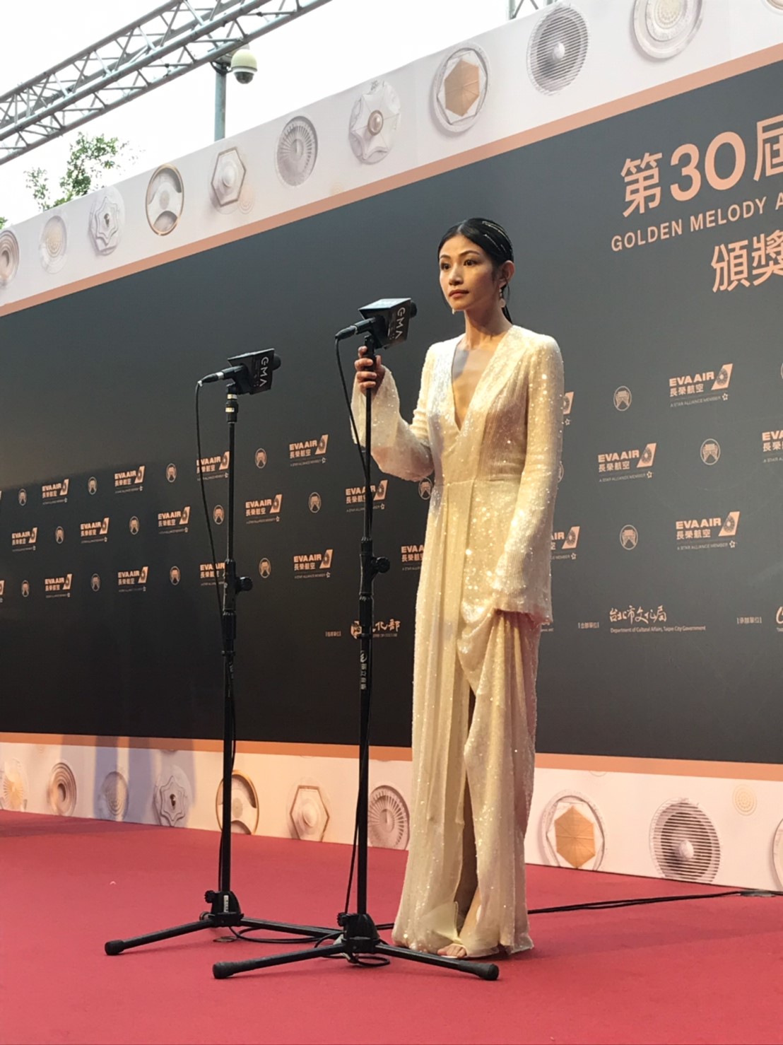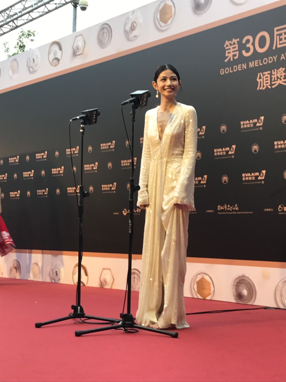 李千那在本屆金曲獎中以專輯《查某囡仔》入圍最佳台語女歌手獎、最佳台語專輯獎、年度專輯獎三項大獎,而她今日也以一襲白色深V長裙現身紅毯,不過卻因為身形過瘦而引起許多網友討論。