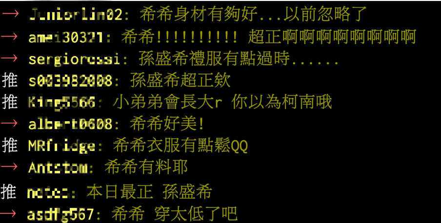 PTT直播討論上看見孫盛希出場後,網友一面倒的大讚孫盛希的身材超級好,紛紛留言:「本日最正 孫盛希」、「希希 穿太低了吧」、「希希衣服有點鬆QQ」、「希希好美!」、「希希有料耶」、「孫盛希超正欸」、「感覺好大」、「希希身材有夠好...以前忽略了」,網友都相當驚嘆。