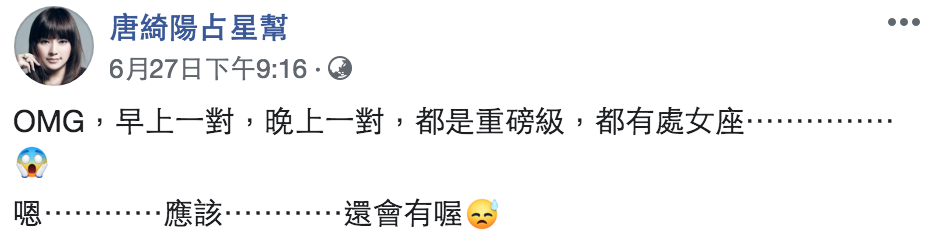 27日晚間,唐綺陽在臉書發文:「OMG!早上一對,晚上一對,都是重磅級,都有處女座…嗯…應該…還會有喔!」此文一出網友也開始找尋演藝圈有哪些「處女座情侶」,並發現了鹿晗與關曉彤這一對,不僅女方是處女座,且曾和他們接觸過的明星情侶檔不是離婚就是分手。