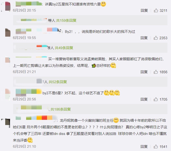 29日播出《明日之子》第3季最新一集,BY2的評比結果出爐,最終只獲得5顆星,其他選手露出不敢置信的表情,唯一沒給星的導師龍丹妮表示,「如果不是10年前那首歌,我會給這顆星」,並希望BY2能撕開過去的自己,對於這樣的結果,許多網友都直言無法接受,也無法理解龍丹妮的評分標準,「講真,裡面除了by2我真不知道誰有資格拿6星」、「龍丹妮就像一個尖酸刻薄的班主任」、「留出未来的進步空間?是個什麼說詞?那所有人都不要評六星啊,都給留進步的空間!」。