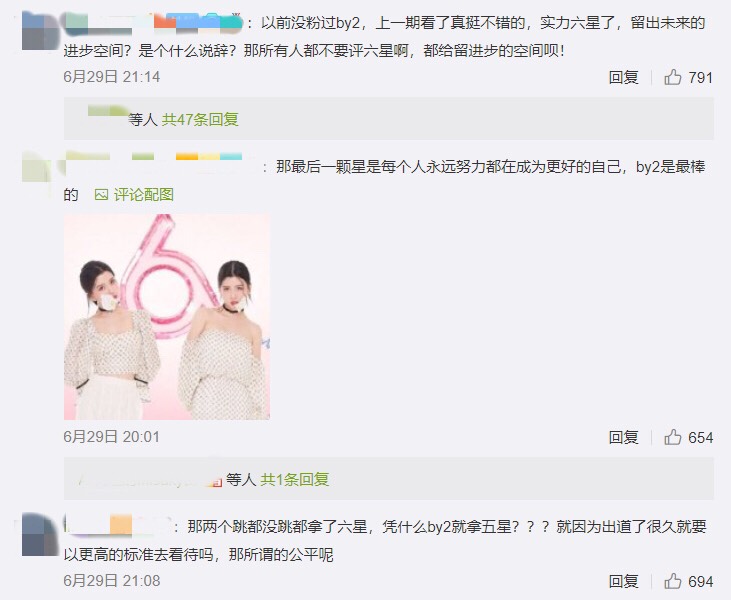 雖然BY2沒能拿到最高分6顆星,但是5星也很厲害了,網友也鼓勵她們,「By2未來可期,相信她們一定會繼續閃耀」、「五星是鼓勵、六星是目標,不斷突破自我,by2姐妹朝著六星衝吧~」、「人生的路不會永遠停留在一馬平川,就算前路崎嶇溝壑,但今後的by2一定會帶著勇氣和決心走得更好更遠~!」,大家肯定都看的到她們的努力,期待看到BY2帶來更多精彩的表演。