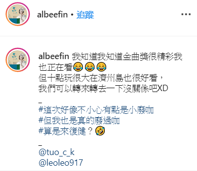 Albee也在貼文表示:「我知道我知道金曲獎很精彩我也正在看,但十點玩很大在濟州島也很好看,我們可以轉來轉去一下沒關係吧XD」,並自嘲自己是小廢咖,算是來復健。玩遊戲獲得勝利固然重要,但別忘了安全第一。