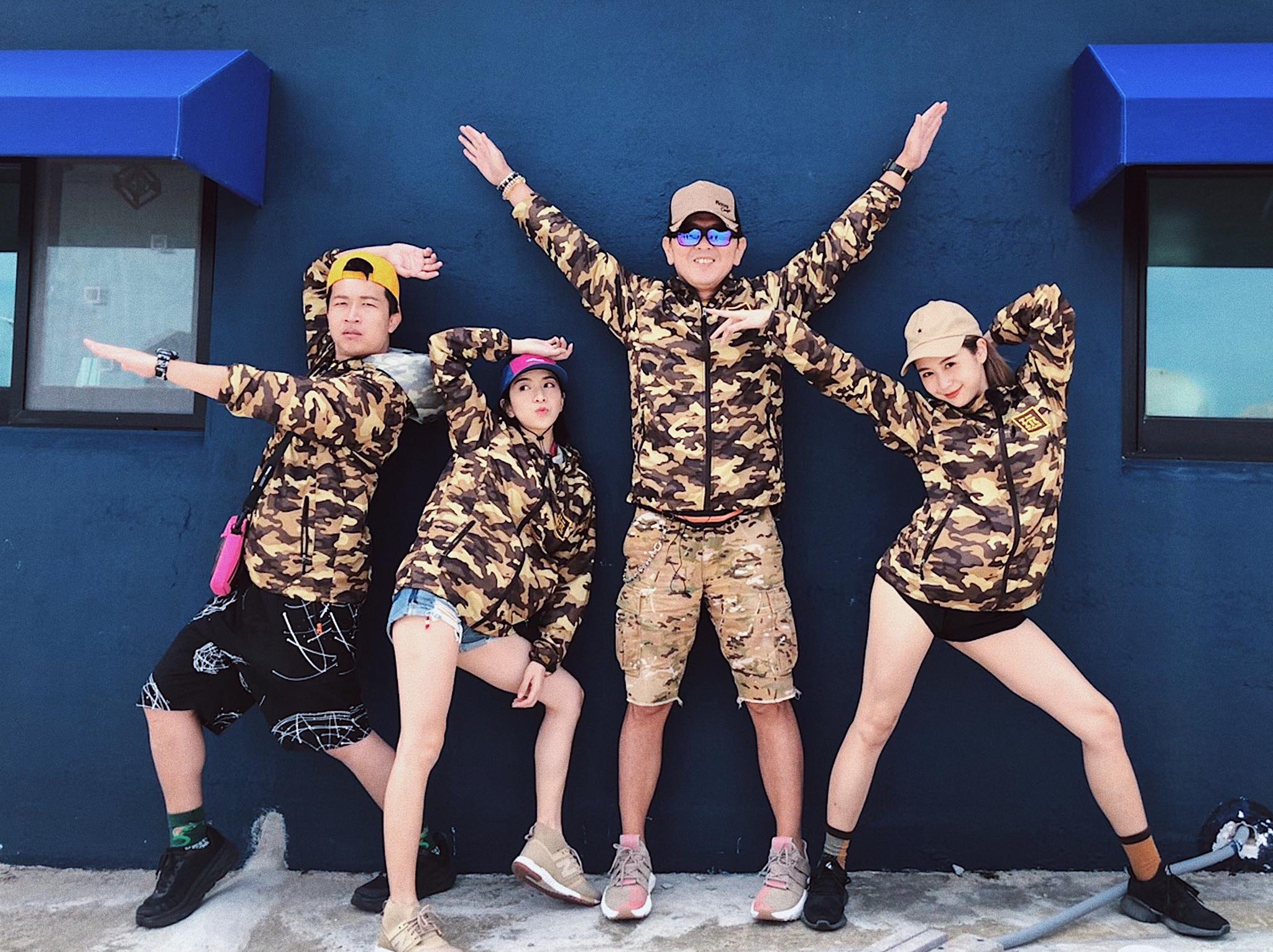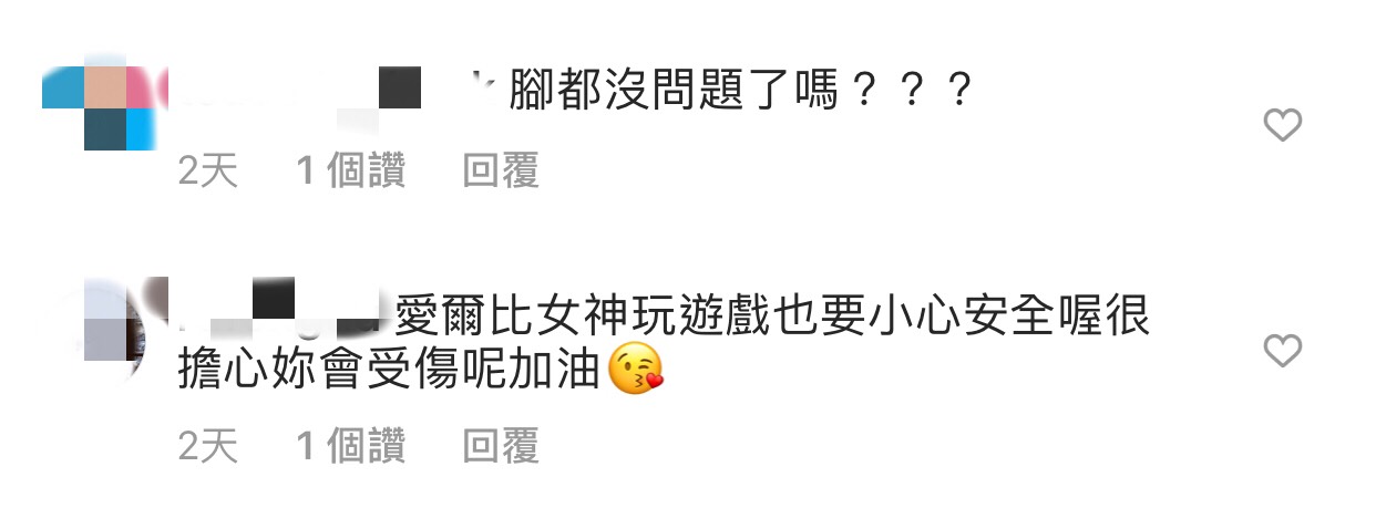 從照片中可以看到,Albee和隊友庹宗康、張立東、梁凱莉都穿上迷彩外套,但Albee下半身穿著超短熱褲,雙手上拉、扭腰擺臀的動作讓短褲更上移,性感蜜大腿被看光光,網友忍不住留言,「美鵝腿」、「這蜜鵝腿…」、「快走光了啦」。粉絲也非常關心Albee的腳傷,「腳都沒問題了嗎???」、「愛爾比女神玩遊戲也要小心安全喔,很擔心你會受傷呢加油」。