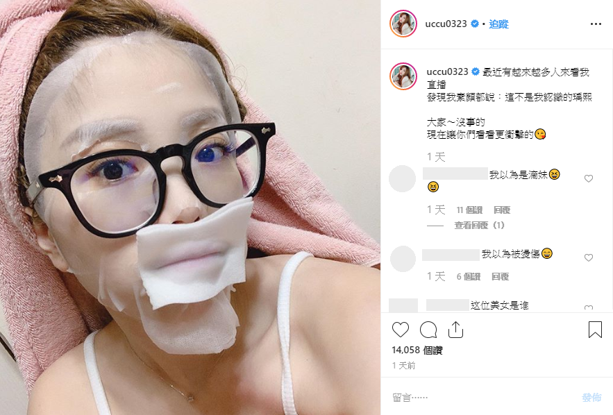 瑀熙近日在ig中發文:「最近有越來越多人來看我直播,發現我素顏都說:這不是我認識的瑀熙,大家~沒事的,現在讓你們看看更衝擊的」,搞笑放上自己敷面膜的樣子,只見照片中的她除了面膜之外,嘴唇上更是特別敷了一層化妝棉,模樣略顯滑稽。