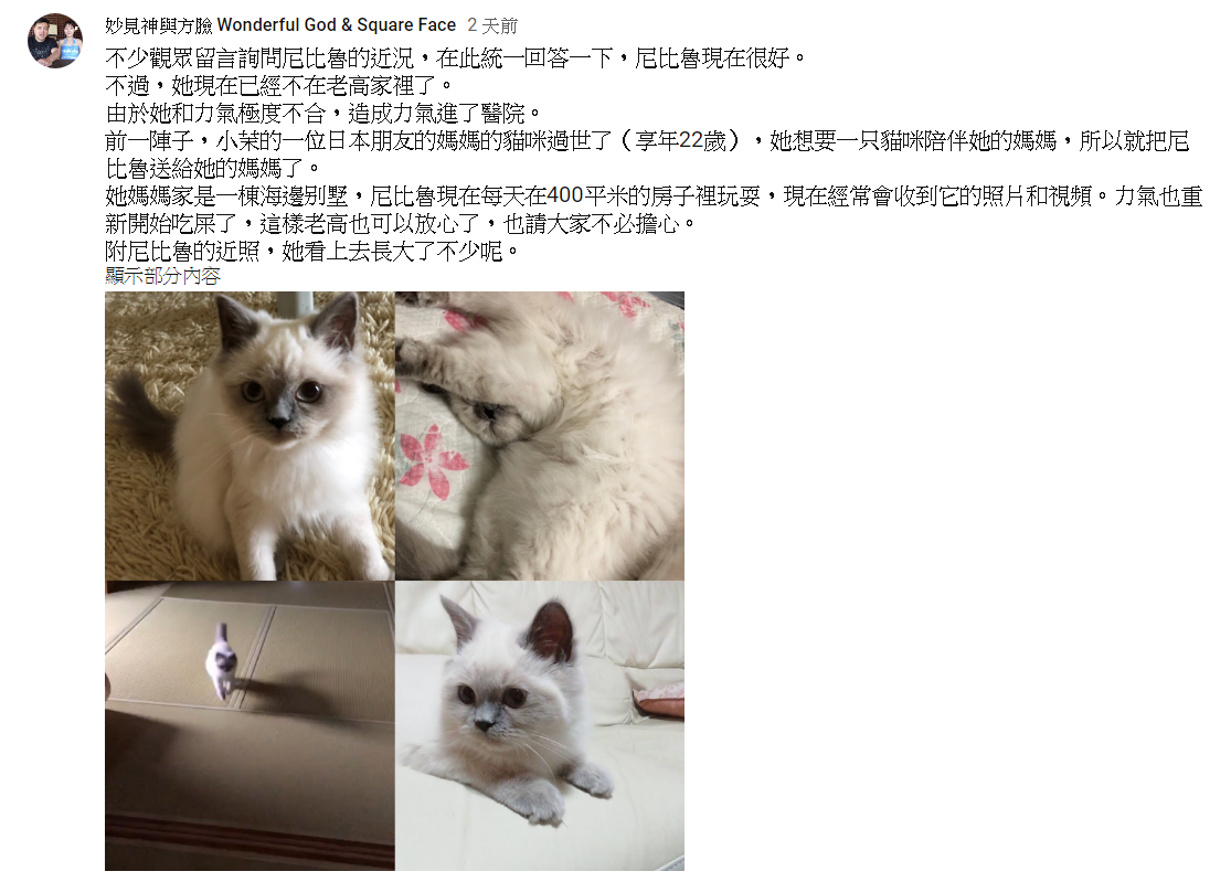 許多網友關心並詢問尼比魯的近況,因此老高發文來回應大家,文中寫道,現在尼比魯已經不在老高家裡了,前陣子,小茉一位日本朋友的媽媽養的貓咪過世了,朋友希望能有一隻貓咪陪伴媽媽,所以就把尼比魯送給朋友媽媽,朋友媽媽家是一棟別墅,現在尼比魯每天在400平米的房子裡玩耍奔跑,從照片可以看到牠幸福慵懶的睡到翻肚,而且長大了不少呢。