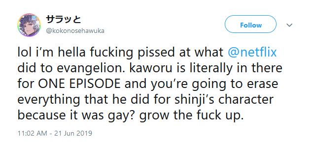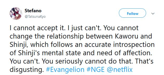 有不少粉絲因為新版字幕,上Netflix的官方推特痛罵,並要求說明改字幕的用意,而這個消息也在英語圈的動漫新聞引起騷動。其中有網友留言:「我真的無法接受,我就是不能,你不能改變渚薰跟真嗣的關係!」、「我真的很火大Netflix對EVA幹的事,這一集可以說是渚薰的主場卻被抹煞了,只因為牽涉到同性戀嗎?」紛紛對Netflix提出抗議。
