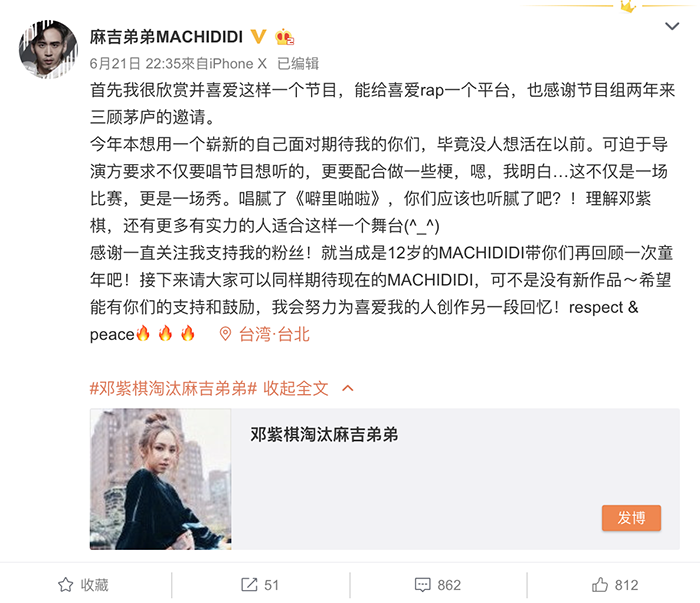 麻吉弟弟在12歲時就踏入樂壇,當時以「倒著念」的饒舌爆紅,當時麻吉可以說是和熱狗同一時期的饒舌歌手,後來回美國發展當DJ,一直到了2015年時才正式回歸歌壇。然而這次麻吉弟弟也前往大陸參加《中國新說唱2》,卻在體育館海選時慘被其他台下的選手砲轟,在21日節目播出後,麻吉弟弟隨後也在社群平台上發文講出「節目的內幕」,但熱狗近日接受訪問時,也替節目組反駁。