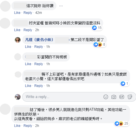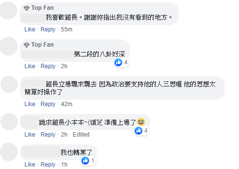 文章發布後,網友也紛紛留言:「我喜歡館長。謝謝妳指出我沒有看到的地方。」、「第二段的八卦好深」、「館長立場飄來飄去 因為政治要支持他的人三思喔 他的思想太簡單好操作了」、「跪求館長小本本~」、「第二段感覺水很深! 敲碗啊~」、「還好我沒粉過,剛知道這個人就覺得他反反覆覆,看到開始賣衣服之後,就更明白了」不過也有網友為館長發聲,認為廣告小妹不應該無端出來diss館長。