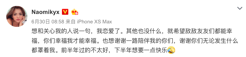 Naomi自去年12月宣布和Alrocco分手後,生活皆以工作為主,在30號時卻在微博上公布自己戀愛了,並打上:「想和關心我的人說一句,我戀愛了。希望敵友們都能幸福,你們幸福我才能幸福。謝謝一路陪伴我的你們,謝謝你們無論發生什麼都罩著我,前半年過得不太好,下半年想要過得快樂一點」。文章中只有PO出自己的個人照,沒有分享出另一半是誰,簡單交待自己的狀態而已,讓粉絲紛紛在下面留言:「祝福祝福 好想看看他的照片」、「那個男生這麼有福」、「要注意隱私 別被不懷好意的人盯上 要祝福!」