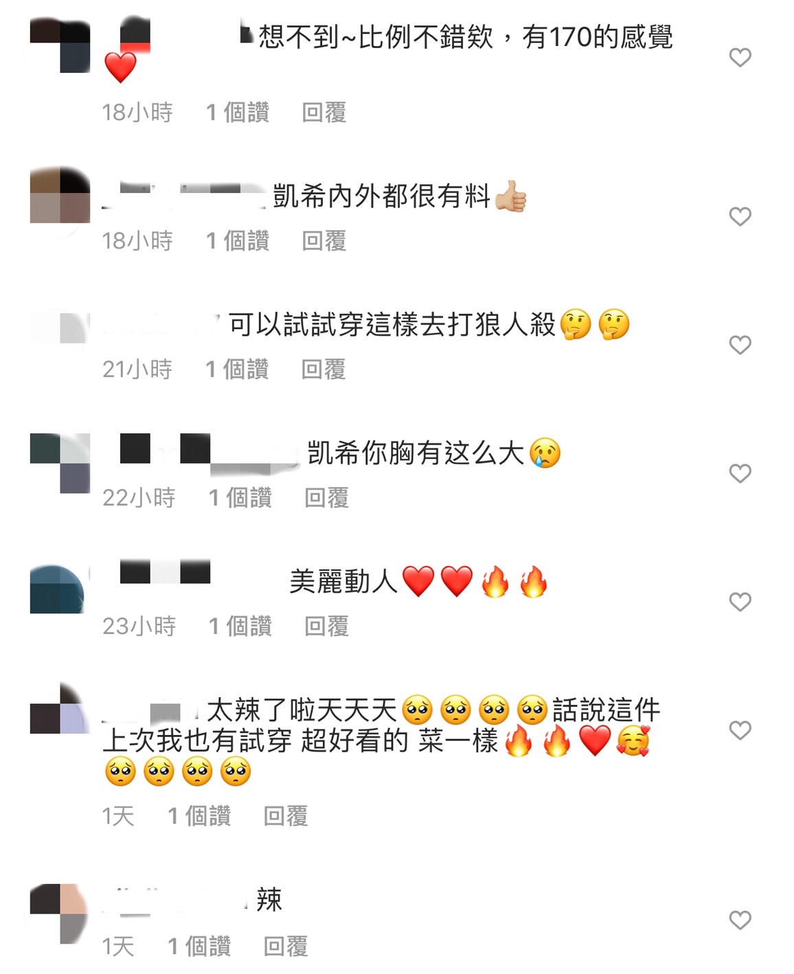 看到徐凱希曬出的性感泳裝照,引來大批粉絲留言稱讚,「辣~~」、「想不到~比例不錯欸,有170的感覺」、「原來這麼有料!」、「哇愷希穿比基尼太性感了」、「人雖小(個子),該有都有了......」,還有網友建議凱希穿泳衣去主持天才衝衝衝和玩狼人殺,還表示穿這樣去玩狼人殺根本逼狼人現身,泳裝照獲得一致好評,連張語噥都不敢置信的驚呼,「OMG 這不是徐凱希~~~~太美了」。