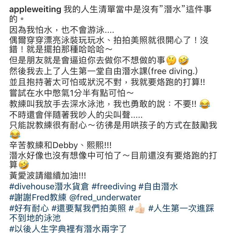 雖然Apple經常在IG曬泳衣照嶄露好身材,但事實上她非常怕水、也不會游泳,不過近期她嘗試克服心中的恐懼,和朋友去上「自由潛水」課程。Apple分享心得 :「在水中憋氣1分半有點可怕~教練叫我放手去深水泳池,我也勇敢的說不要!不時還會伴隨我吵人的尖叫聲」並表示還好教練有耐心,用哄孩子的方式鼓勵她,讓她覺得潛水好像也沒想像中可怕。