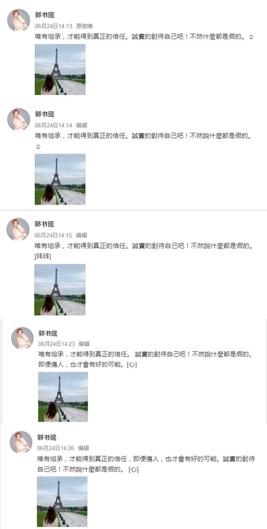 以綸目前人在大陸拍攝新戲《初戀了那麼多年》社群網站上的PO文幾乎都與工作有關,不過瑤瑤日前一連發了好幾篇「勸世文」,6月24日她在微博貼了一張照片,還寫著:「唯有坦承,才能得到真正的信任,誠實地對待自己吧!不然什麼都是假的。」不過在發文後的10分鐘內,瑤瑤一連編輯了5次,一開始原本是笑容符號,後來改為「掰掰」揮手的圖形,最後留下愛心。
