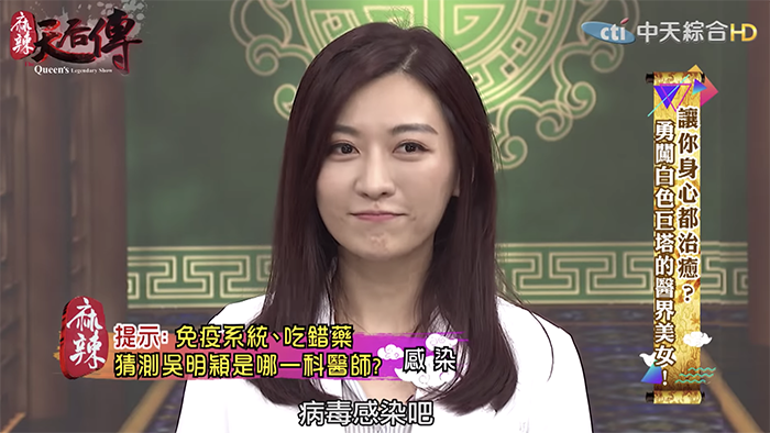 該位皮膚科醫生名為「吳明穎」,目前在長庚醫院任職,她擁有一雙水靈靈的大眼,且她的長相非常甜美清純,全身上下也散發出一股優雅的氣質,一出場就讓現場的班底們都驚呼連連,就連主持人利菁都忍不住多次稱讚:「妳很漂亮耶,本人真的很漂亮」,而她也在節目中展現出非常專業的一面,解釋著皮膚出現狀況時其實和免疫系統是息息相關的,大根聽完後更直呼:「我已經想去掛號了」。