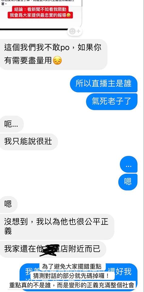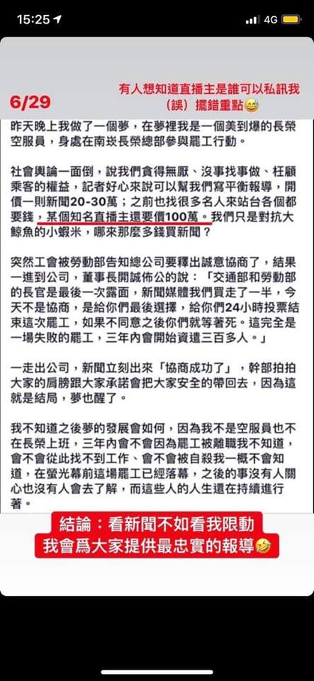 「唐明翎」在文中附上圖片,只見其中寫道空服員想找媒體、名人幫忙平衡輿論聲浪,卻都因高額的收價而卻步,更指出「某個知名直播主還要價100萬」!而另外一張截圖,則透露線索「我只能說很壯,我以為他也很公平正義」,讓人一看就可以猜出在指館長。