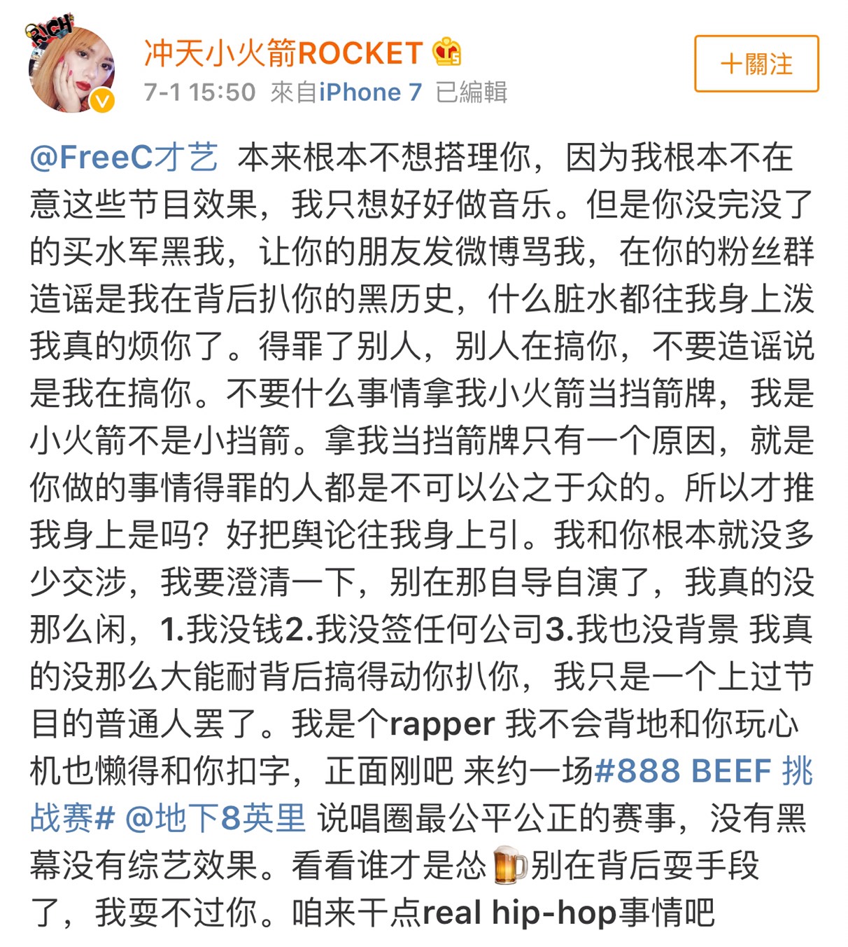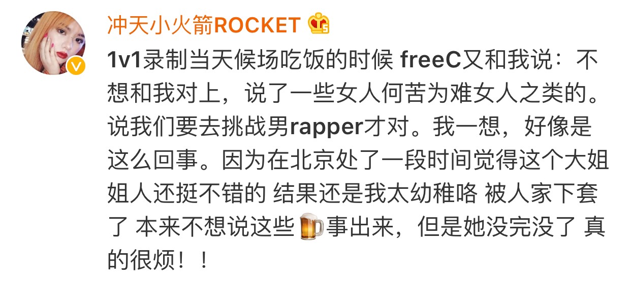 在嘻哈圈中,女rapper比起男rapper來說比較少見,然而在《中國新說唱》第二季時出現「Free C」,瞬間成為了矚目的焦點。節目也因為後期剪輯的關係,FreeC被安排與另一位女Rapper「沖天小火箭」發生了beef(暗指雙方不合,並用唱樂的方式解決)的小插曲,讓觀眾誤以為兩人之間會掀起一場惡鬥。之後沖天小火箭也在微博發文說:「#Free C我本來不想搭理你,因為我根本不在意這些節目效果...甚麼髒水都往我身上潑...我是個Rapper我不會背地和你玩心機也懶得和你扣字..」