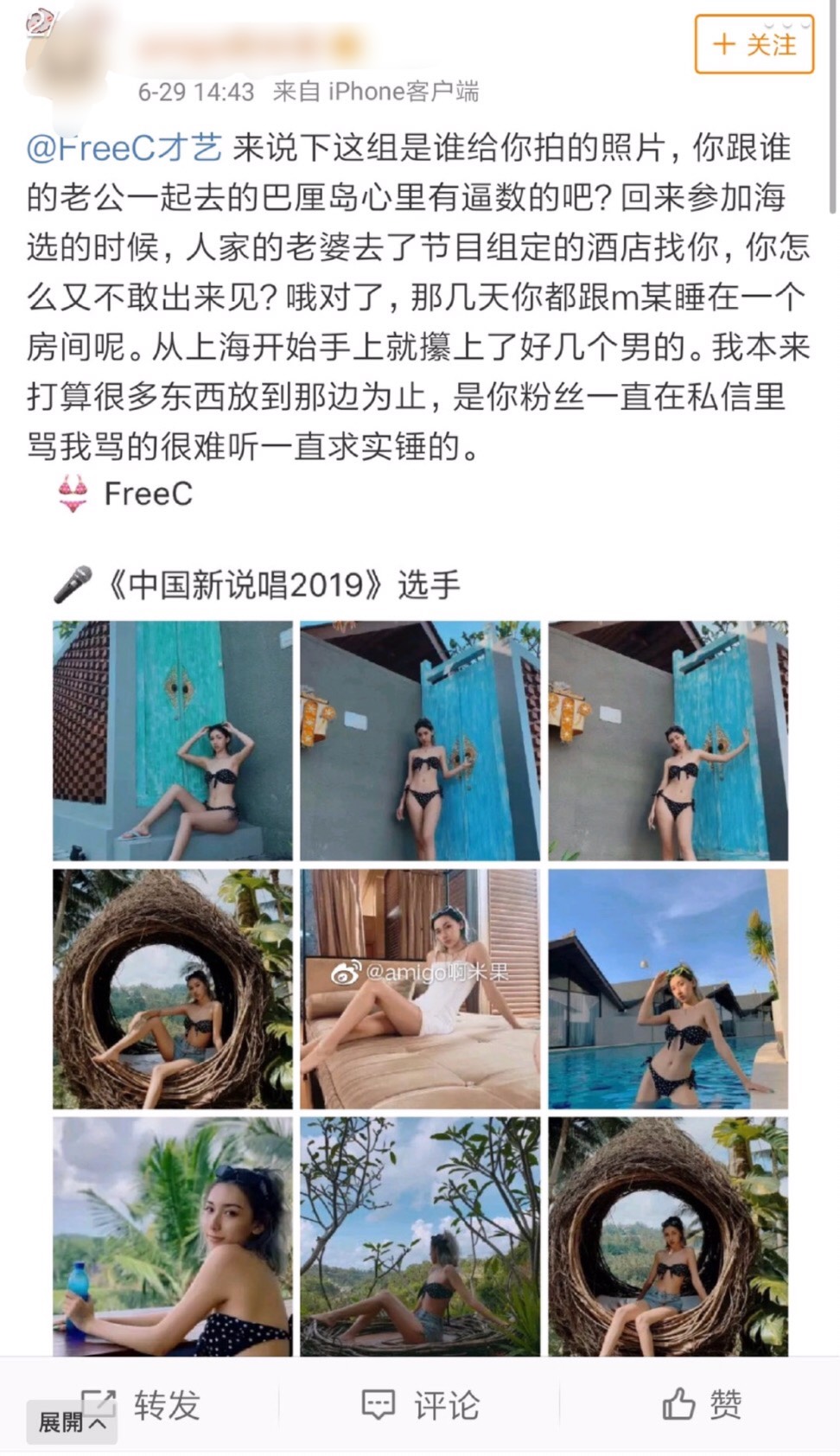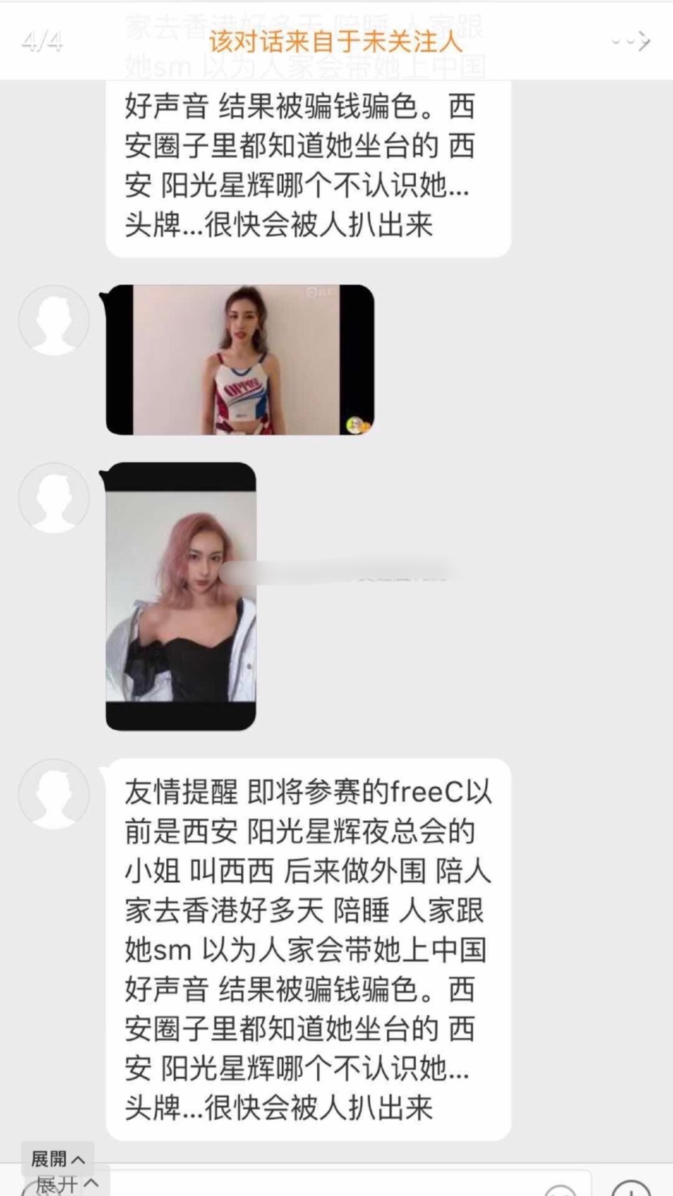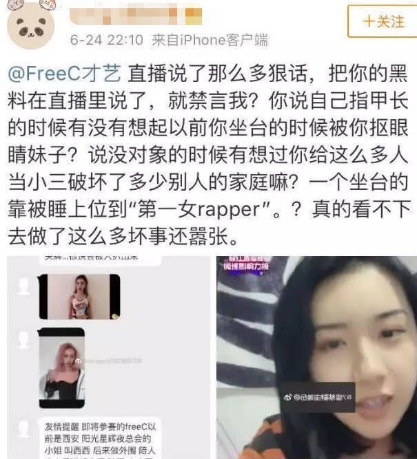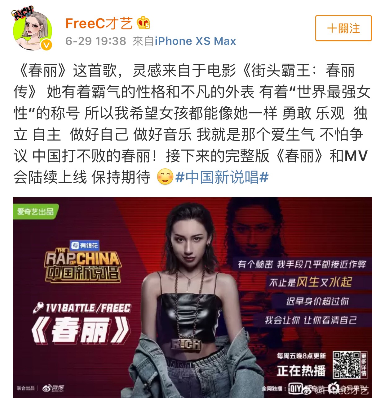 《中國新說唱》是《中國有嘻哈》的前身,以嘻哈為主的網路綜藝節目,節目裡有四組製作人導師,分別為吳亦凡、MC HotDog與張震嶽、潘瑋柏和鄧紫棋。隨著《中國新說唱》再次熱播,嘻哈音樂節目再次掀起一股熱潮,受到許多關注,今年的比賽中,除了來自CSC的大傻、劉聰...等,其中有一位女選手「Free C」也引起大家討論,然而這位女選手竟在網上被人爆出超多黑歷史,引發熱議。