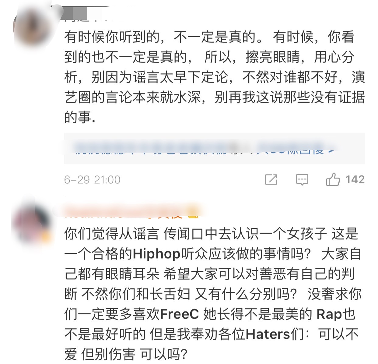 隨著《中國新說唱》節目知名度越來越高,網上討論度直直飆升後,Free C的黑幕一一浮上檯面檢視,不僅接二連三的爆掛,連音樂也被質疑,不過這些黑幕也讓Free C的名聲遭受影響,網友直說:「抄襲阿」、「有後台」、「詞真的沒什麼含金量」,但有另一部分網友也為Free C抱不平:「有時候聽到不一定是真的」、「希望大家對善惡有自己的判斷」、「別因為謠言太早下定論 不然對誰都不好」