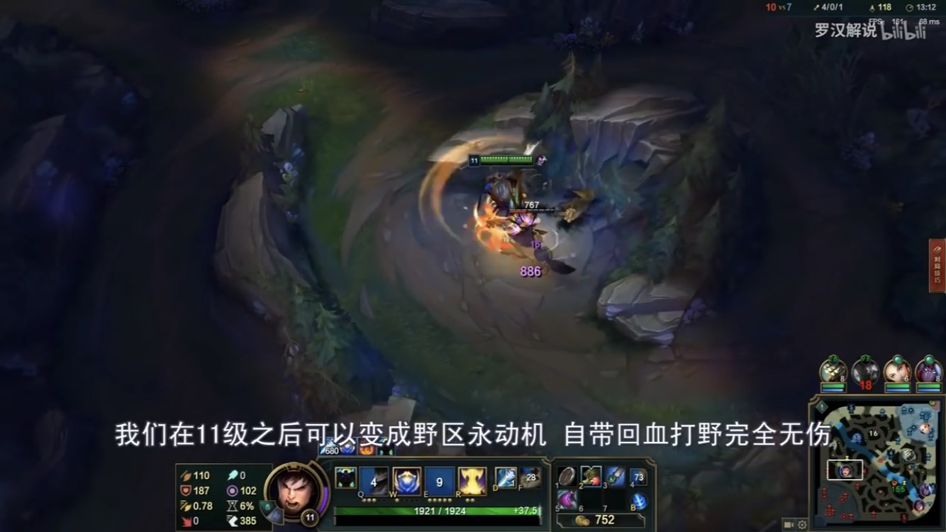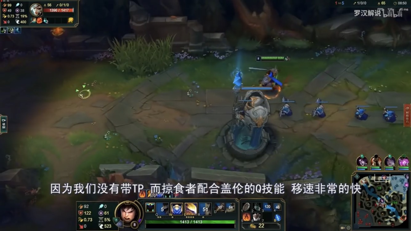 羅漢老師在遊戲中讓蓋倫戴上重擊,原因在於他可以出野刀來吃野怪減少耗血,更能藉由吃野怪來累積雙防;選擇掠食者則是因為蓋倫本身不缺傷害,而是逃跑及追人的速度,羅漢老師說明:「掠食者配合蓋倫的Q技能,移動速度非常快,這樣可以讓我們快速回到線上,上線快、不會漏兵節奏更舒服」,他也提到這個套路的精隨,就在於透過挨打來浪費對面時間,進而創造優勢。