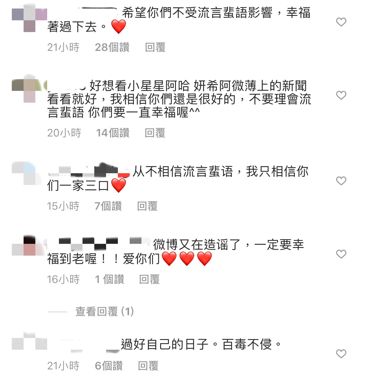 男方工作人員出面否認後,陳妍希3日在Instagram曬出兒子萌照,並寫道,「寶貝們用胡蘿蔔餵兔子的初體驗」,直接打臉久沒見到兒子的謠言。照片中小星星和朋友們相處融洽,並蹲在地上認真的餵小兔子吃紅蘿蔔,也透露出帶兒子去墾丁玩,小孩根本不在公婆家。網友們也紛紛在照片下留言,「希望你們不受流言蜚語影響,幸福著過下去」、「從不相信流言蜚語,我只相信你們一家三口」、「過好自己的日子,百毒不侵」。