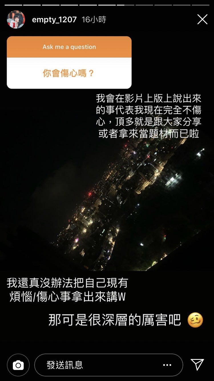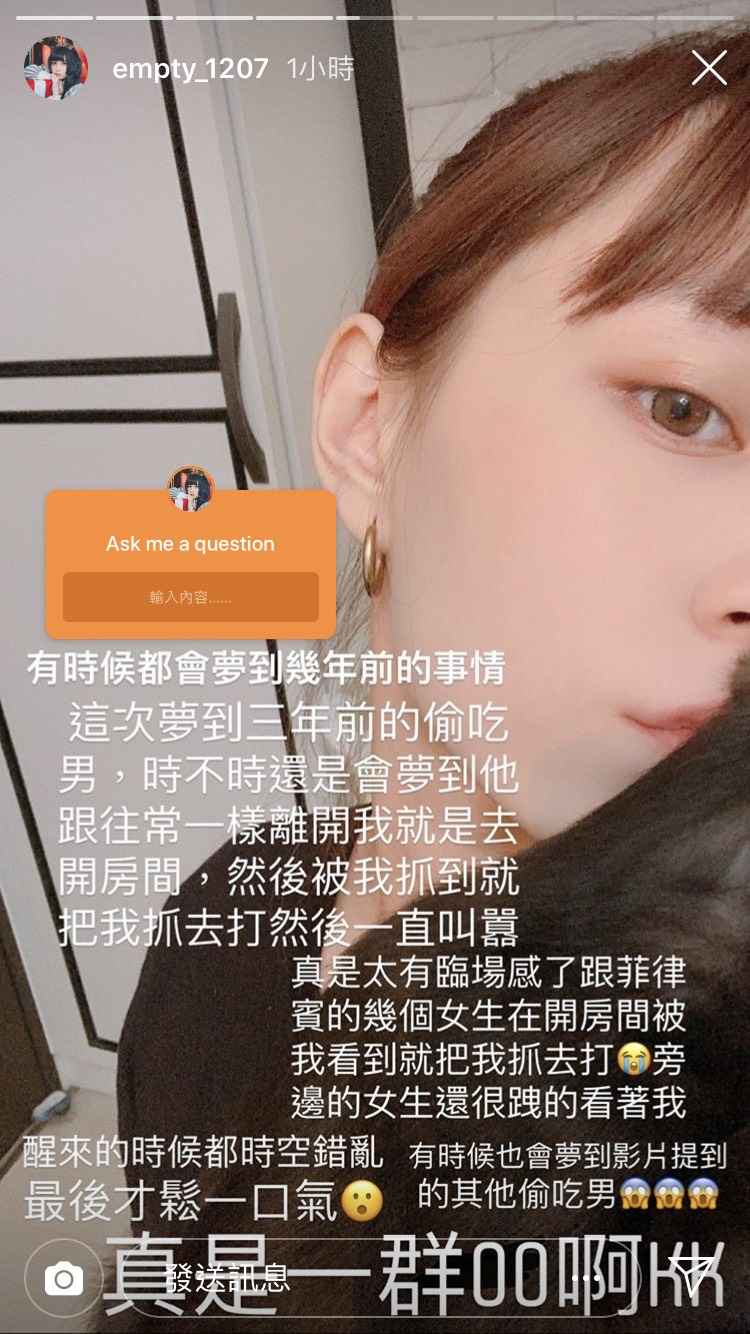 本本昨(3)日在IG限時動態中發文,提到自己有時候做夢都會夢到過去傷害自己的前男友,「夢到他跟往常一樣離開我就是去開房間,然後被我抓到就把我抓去打,然後一直叫囂」,原來當時的男友跑去跟幾位菲律賓女生開房間剛好被她抓到,不過沒想到抓包後,男友不但沒有道歉,反倒是向她動粗,「旁邊的女生還很跩地看著我」。