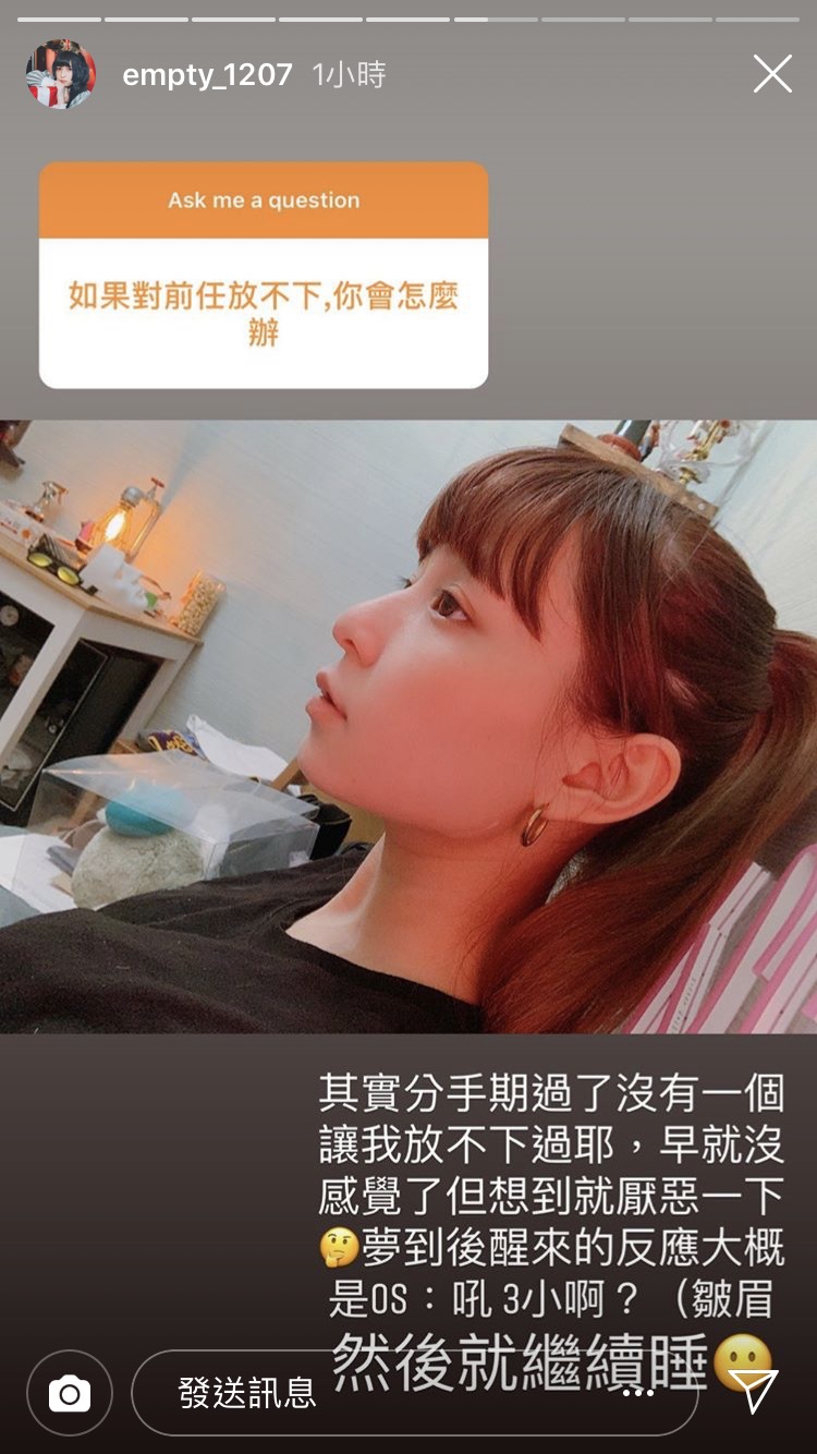 本本透露因為夢境太真實,醒來時還會讓她時空錯亂,最後才鬆一口氣,提起過去碰到的渣男,她也無奈打上:「真是一群OO啊!」不過本本雖然會夢到前任,她卻也說明自己已經完全放下過去,更自嘲「想到就會厭惡一下,夢到後醒來的反應大概是OS:『吼X小啊!』」她也強調自己不會把現有的煩惱、傷心事告訴大家,所以提過的故事全部都已經放下了。