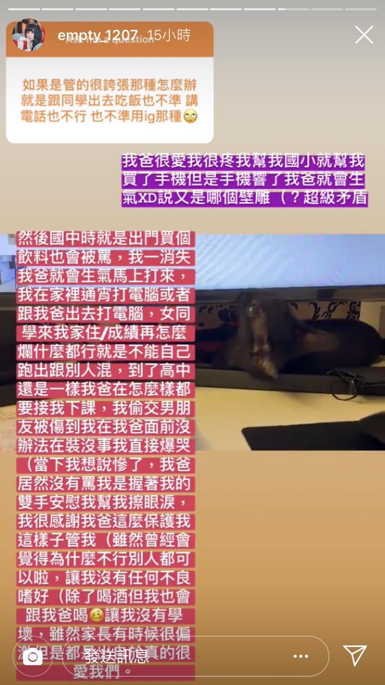 除此之外,本本也提到以前自己情傷時,某次不小心在爸爸面前爆哭,本來以為會被爸爸罵,沒想到平常管束很嚴格的爸爸卻展現了慈父的一面,「我爸居然握著我的雙手幫我擦眼淚,我很感謝我爸這麼保護我這麼管我」,反而讓他們父女感情更好。
