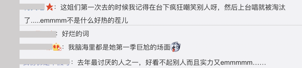 在《中國有嘻哈》播出時有許多網友都認為蜜妞一副自以為是的樣子,但是上場後卻馬上被淘汰非常的尷尬以及好笑,如今蜜妞時隔2年後再度登上《新說唱2》的舞台,而她的歌詞中也寫到「HipHop不分高低貴賤」,再度被網友聯想到過去她看不起男團、女團的Rapper的畫面,引發熱議。