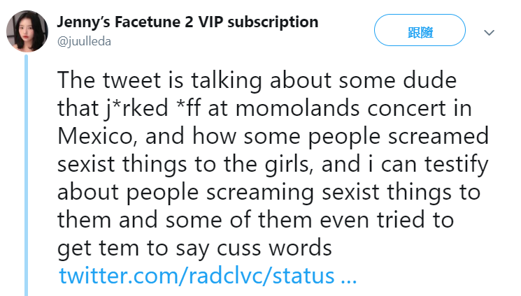 南韓人氣女團「MOMOLAND」是從選秀節目選拔出的女子團體,出道僅兩年半,以一首《BBoom BBoom》爆紅,近日飛往墨西哥舉辦粉絲見面會,成員「妍雨」因個人因素缺席,其他成員按照原定計畫前往墨西哥。在活動結束後,推特突然爆出男飯們在見面會期間,竟然對MOMOLAND成員高喊各種不雅的話。