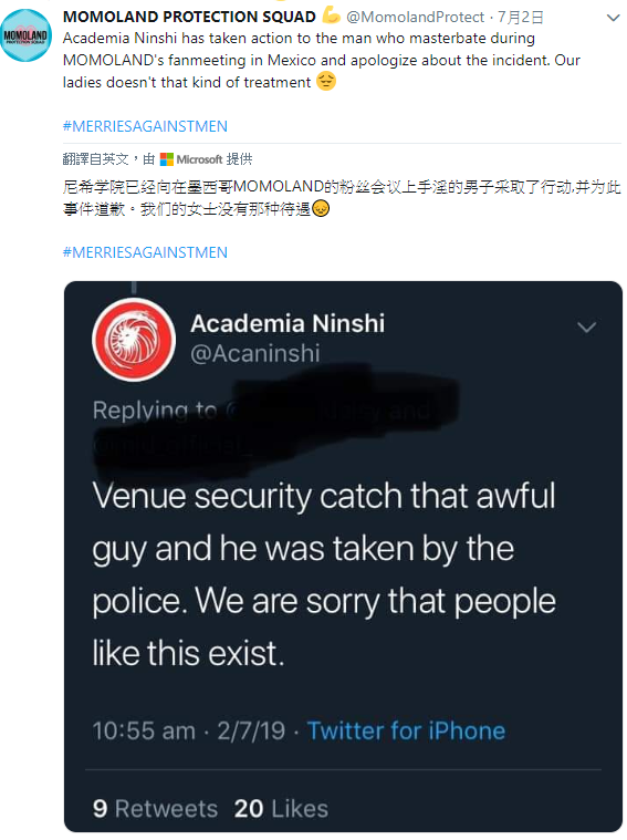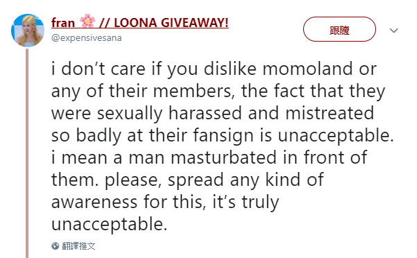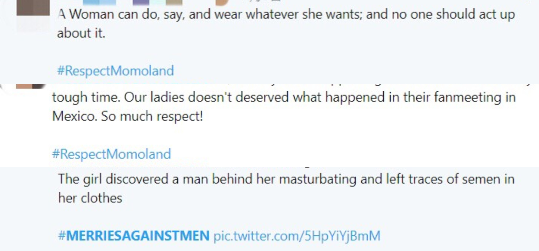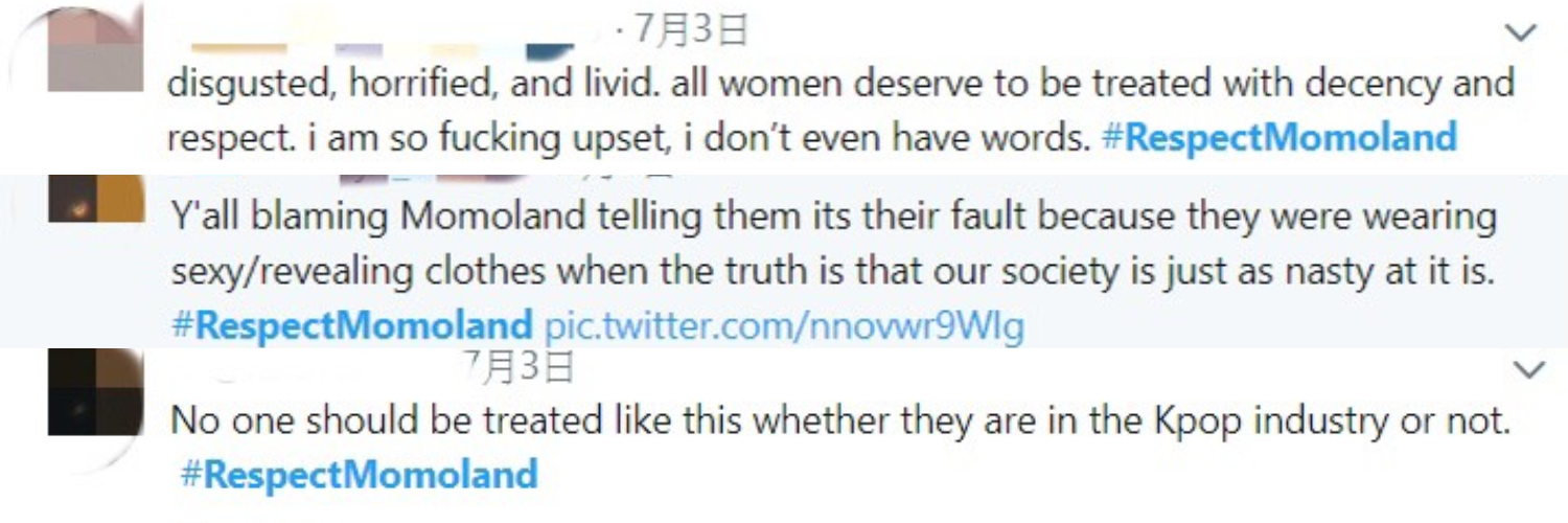 還有人指責是因為MOMOLAND穿著太性感才導致這樣的事件,但無論穿著如何,每個人都應該受到尊重。對於MOMOLAND遭受這樣的待遇,粉絲都很心疼,因此發起了「#MERRIESAGAINSTMEN」、「#RespectMomoland」的hashtag活動,讓更多人關注到此事,也希望不會再有人受到如此不尊重的對待。