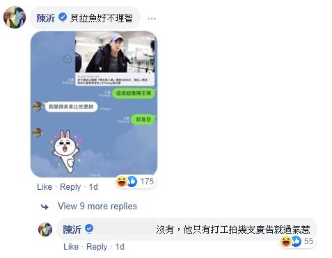 另一方面,陳沂也同步放上和媽媽「貝拉魚」的對話,稱媽媽「很不理智」,原來是媽媽看見彭于晏的照片後,直呼:「我覺得弟弟比他更帥」,才讓陳沂搞笑調侃媽媽,也網友看了哈哈大笑。
