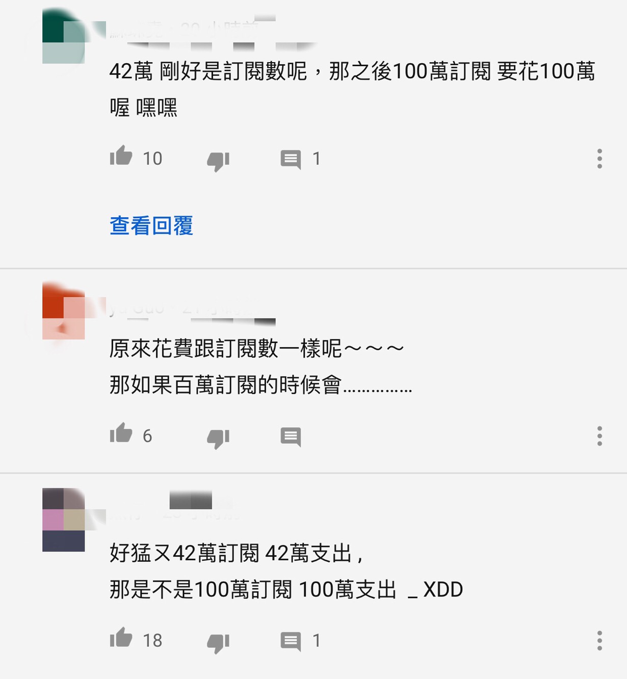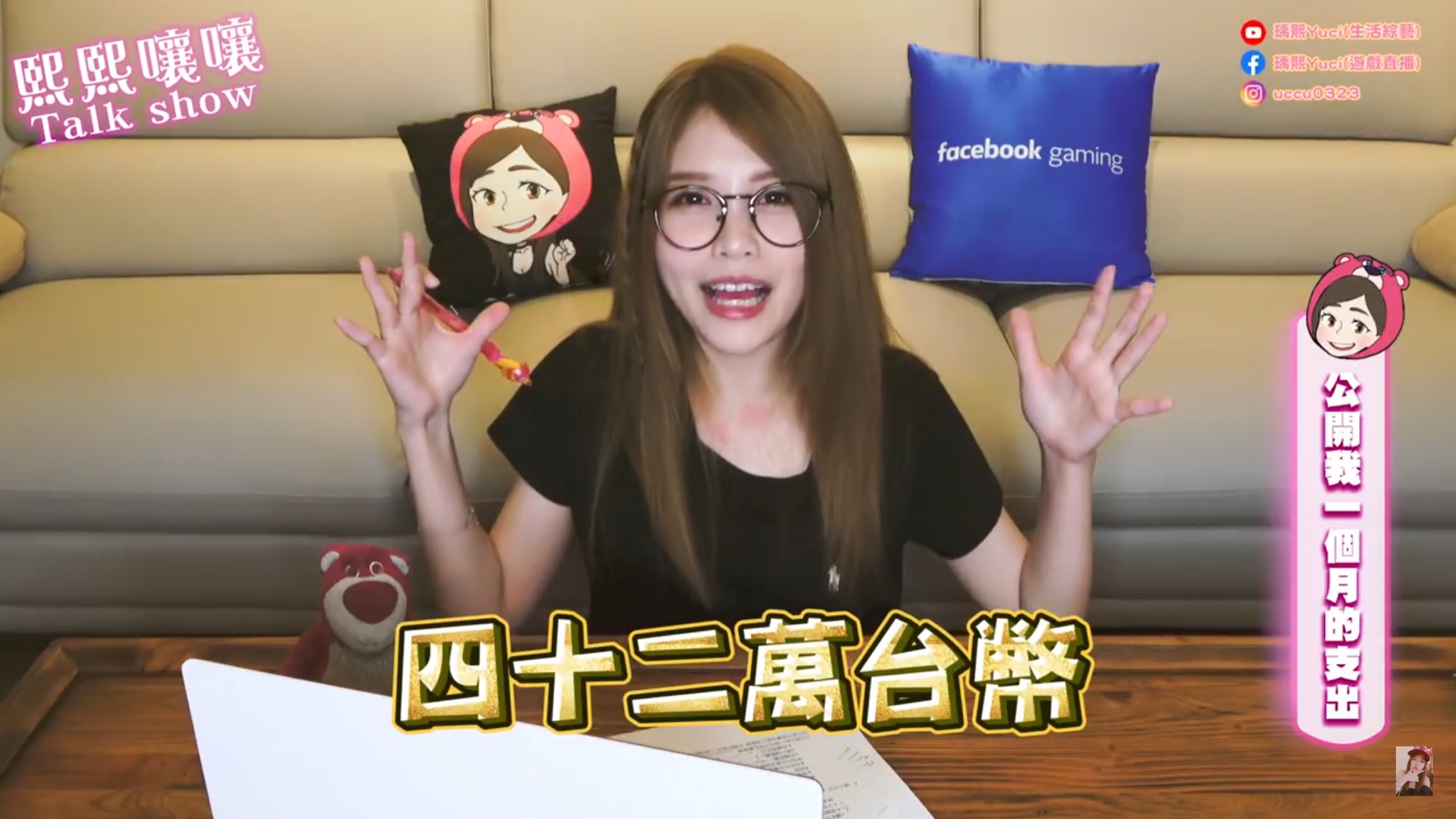 公司支出加上個人支出,瑀熙一個月花費四十二萬元,她本來以為自己一個月支出大約二十萬三十萬,看到這麼驚人的數字,瑀熙決定以後要當一個省錢的人。網友也發現,「42萬剛好是訂閱數呢,那之後100萬訂閱,要花100萬喔嘿嘿」、「我一直覺得42萬已經有出現過很熟悉,原來是訂閱數阿...」、「瑀熙你該不會是月支出=訂閱數吧?」,想必瑀熙的收入一定很高,畢竟賺的多才能花的多。