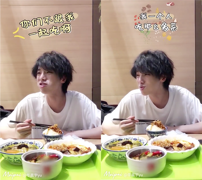 近日曝光了一則華晨宇私底下在吃飯的花絮影片,在影片中華晨宇的面前擺了3道佳餚,在他面前還有一碗滿滿的像一座小山的白飯,而華晨宇也和工作人員說道:「你們不跟我一起吃啊?我一個人吃那麼多菜」,接著又從一旁推了2道菜到面前,大口大口的吃著美食。然而吃到一半時,華晨宇突然開始吃起一大碗的冰淇淋,甚至還一口鹹食配一口冰淇淋,吃法非常特別。