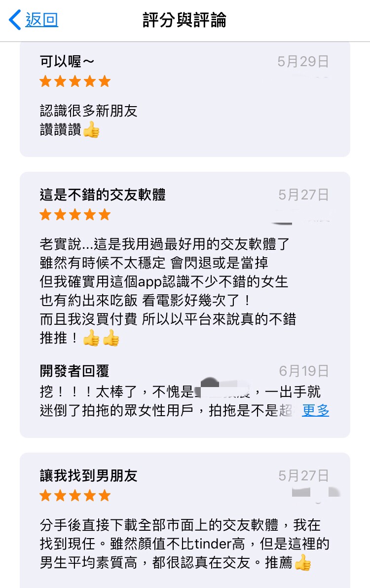 而「無限右滑」這個特色,小編一開始也挺無感的,但後續因為愛分析的職業病,額外下載其他款交友軟體比較後,驚覺拍拖竟是業界唯一將無限右滑功能設定為免費的交友App!!!對於標準高、口味稍微比較“特別”的小編本人,認真覺得拍拖根本是佛心經營!不愧對評價均標達4.8顆星,經營六週年配對數就達成1億對的人間月老稱號!