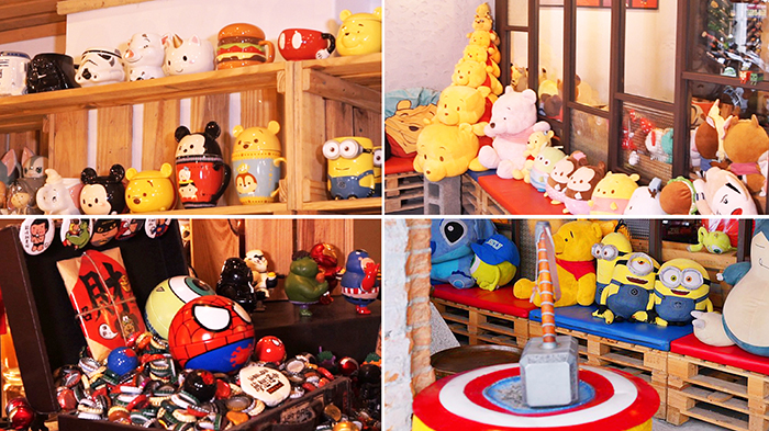還沒進到店裡,我們就被上百隻玩偶的畫面給震撼到了,店家門口的長椅上擺了滿滿的玩偶,任何一個少女都無法忍住不去照相的衝動,應該講至少還包含一名男性,因為製作人兼企劃兼場務兼助理兼臨演的阿猛已經一頭栽進玩偶堆拍起來了,我用鄙視的眼光冷眼旁觀著一個大男人少女心大噴發與各種玩偶合影,而身為男人的自尊,絕對不允許我做出這樣的行為,正當我這樣想的時候,我看見門口出現一個雷神索爾一比一大小的錘子放在美國隊長的盾牌上…等我回過神時我已經自拍了上百張的照片。