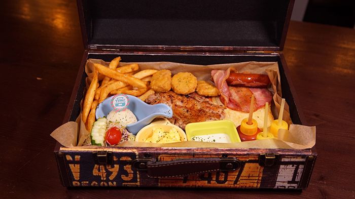坐沒多久,店員突然拿了一卡舊式行李箱放在我們桌上,打開後才發現這是我們的餐點。