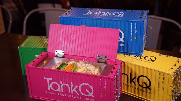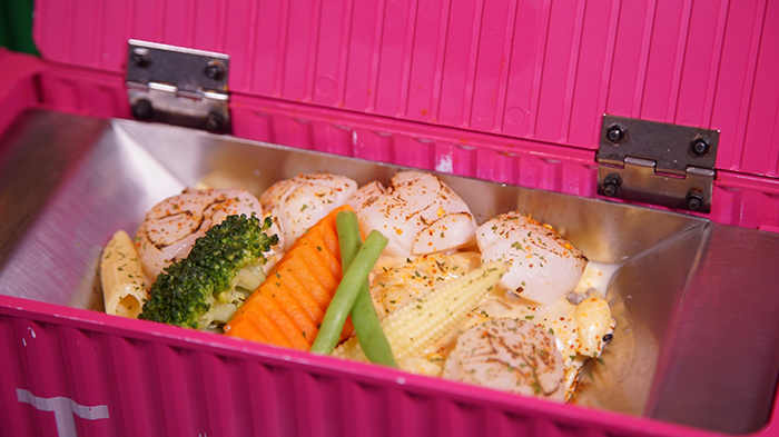 這次的容器看起來像是一卡貨櫃,貨櫃的上方可以打開,再一次的驚呼聲四起,打開後可以看到滿滿的干貝鋪在麵上。